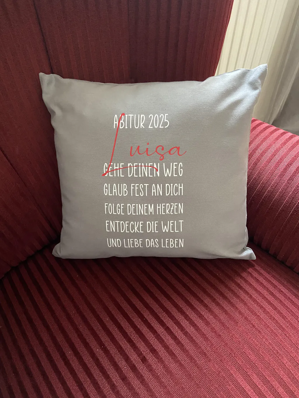Den Text für die ersten beiden Zeilen kannst du frei bestimmen und so das Kissen zu einem ganz persönlichen Geschenk werden lassen.