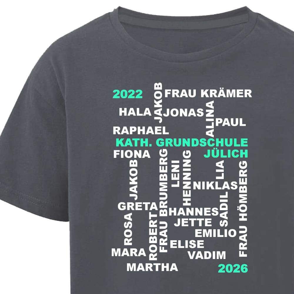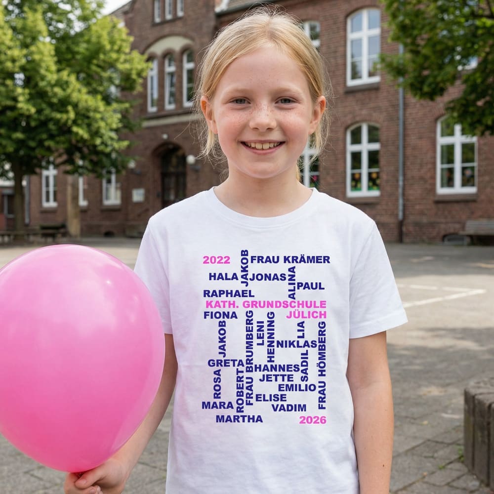 Unsere Abschluss T-Shirts für die 4. Klasse sind individuell gestaltet und mit den Namen aller Schüler bedruckt. So haben die Kinder auch nach der Abschlussfeier eine schöne Erinnerung an ihre Mitschüler und die gemeinsame Schulzeit.