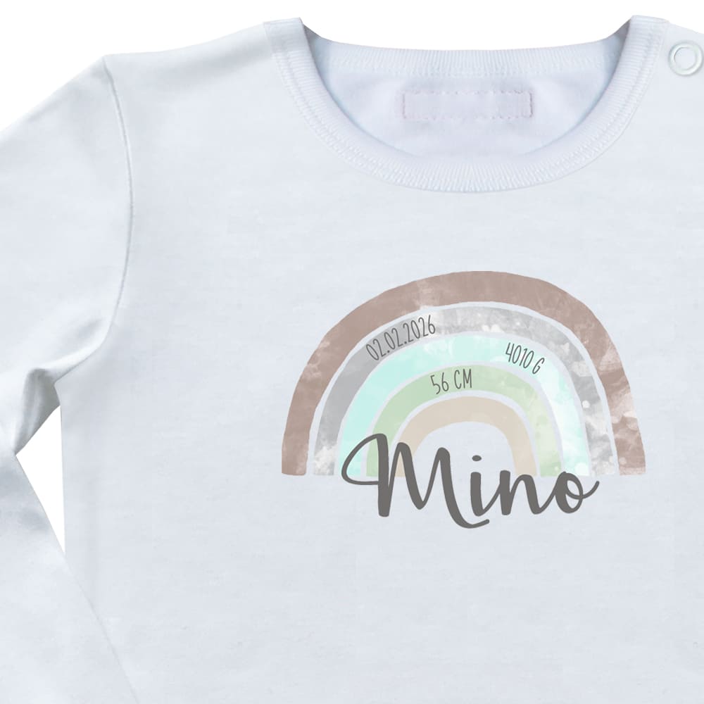 Der Regenbogen im liebevollen Aquarell-Stil wird mit dem Namen des Babys personalisiert. Auf Wunsch können zusätzlich auch die Geburtsdaten ergänzt werden, z.B. Datum, Gewicht und Größe – so wird aus dem Shirt ein einzigartiges Andenken an den Start ins Leben.