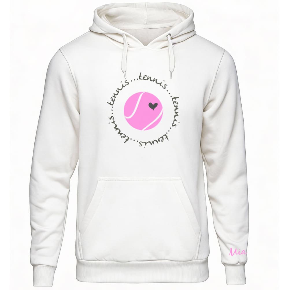 Du liebst Tennis und willst das auch zeigen? Dann ist dieser Hoodie wie für dich gemacht! Der Tennisball auf der Brust wird von einem kleinen Herzchen gekrönt und von dem umlaufenden Schriftzug „tennis…tennis…tennis…“ eingerahmt. Ein Design, das sofort gute Laune macht und jedem klar signalisiert: Hier schlägt ein Tennis-Herz! ♥️🎾