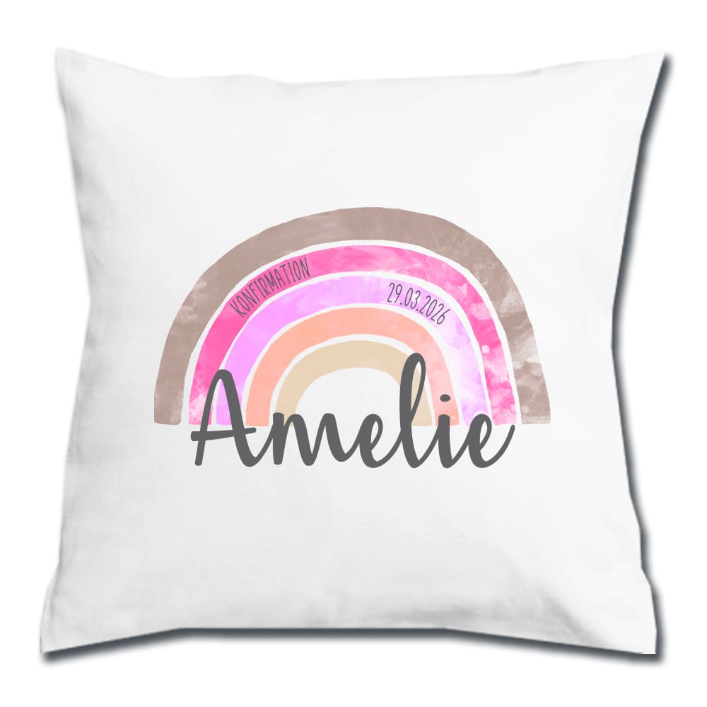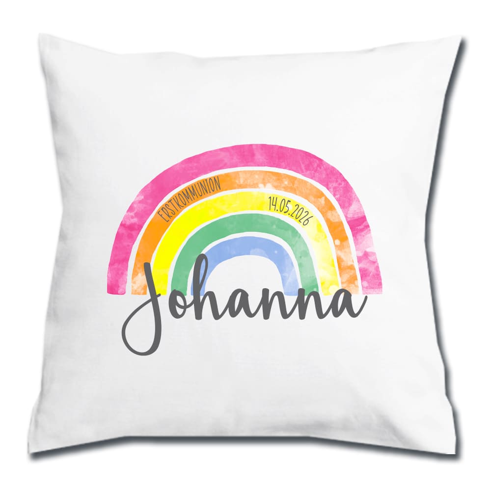 Ein tolles Geschenk zu jedem christlichen Fest wie Taufe, Kommunion, Konfirmation oder Firmung: das Regenbogen-Kissen personalisiert mit Namen und, auf Wunsch, mit dem Anlass und dem Datum des großen Tages.
