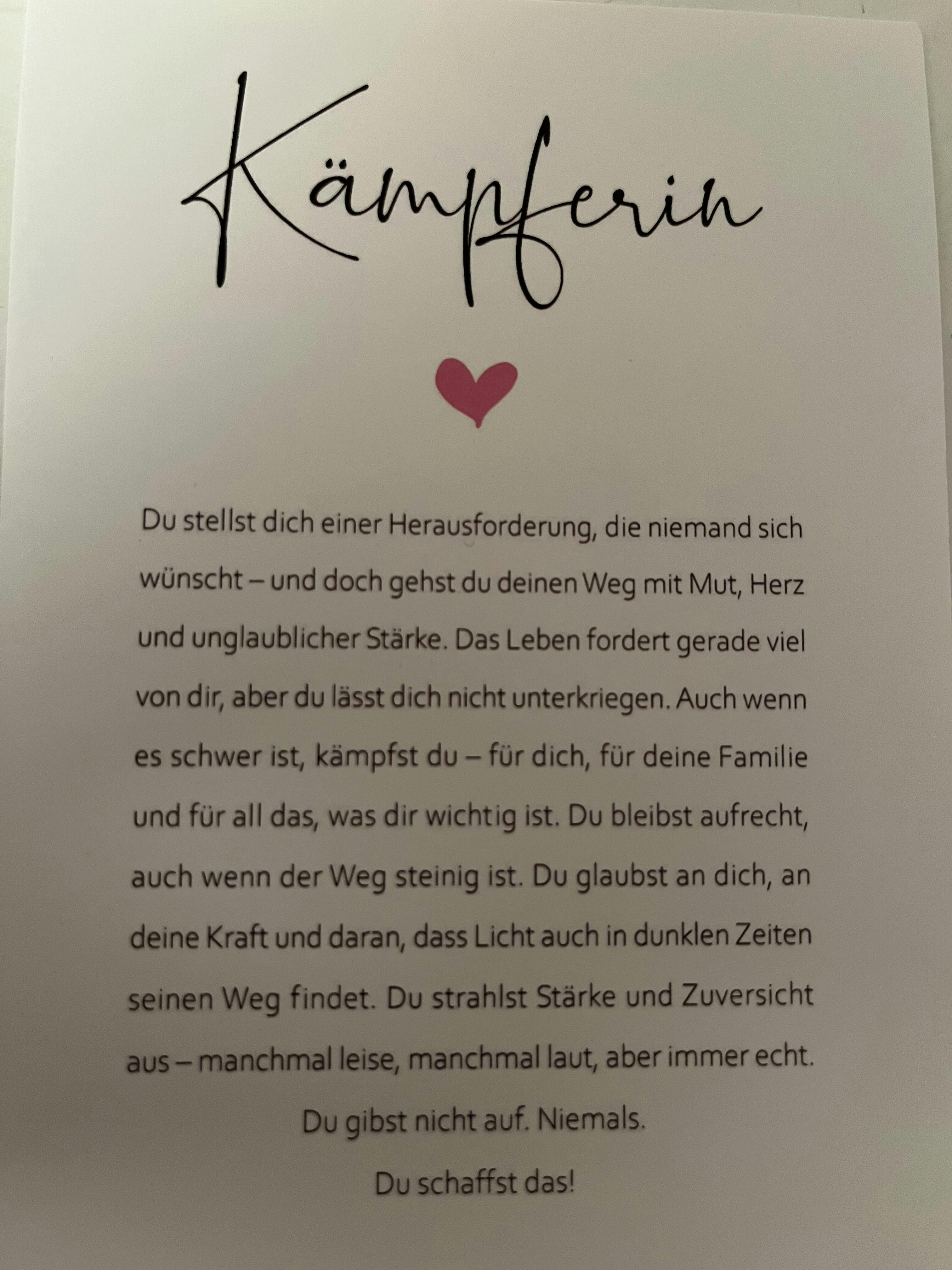 Ich war so begeistert als das T- Shirt kam. Ich habe das für meine beste Freundin bestellt die wirklich eine Kämpferin im Moment sein muss. Die persönliche Karte die von euch dazu gelegt wurde passte so perfekt dazu das mir da schon die Tränen kamen. Geschenkt haben wir das T- Shirt mit 9 Frauen zusammen die ihr immer sehr Nahe stehen und die ihr damit sagen wollen .Wir brauen dich und in Gedanken sind wir immer bei dir.Vielen Dank an euch das ihr solche tollen Shirts mit soviel Liebe verschickt.