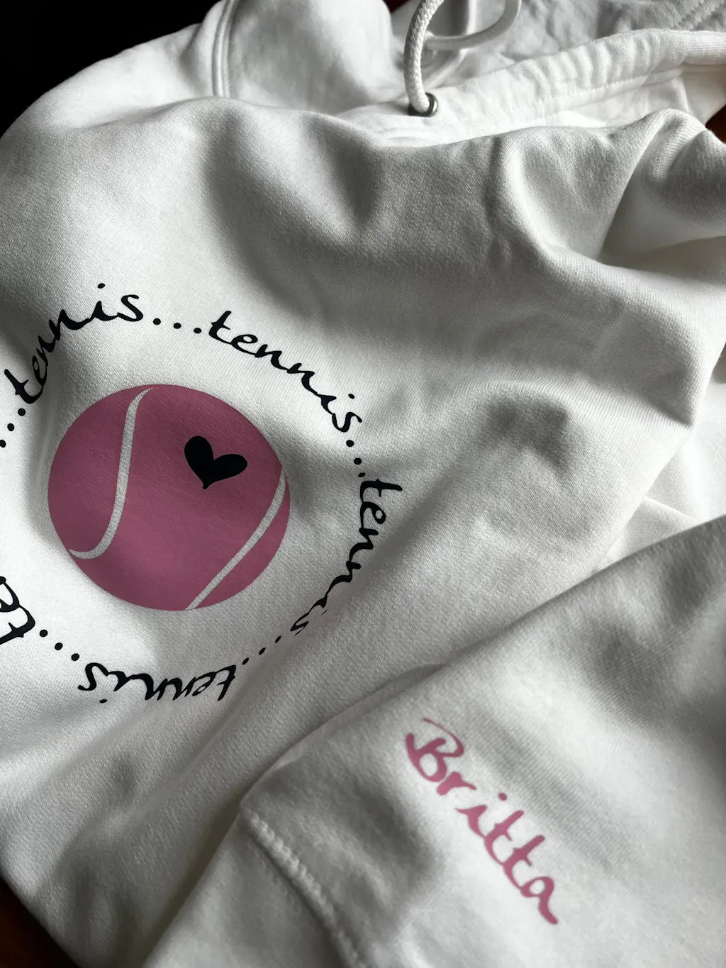 Du liebst Tennis und willst das auch zeigen? Dann ist dieser Hoodie wie für dich gemacht! Der Tennisball auf der Brust wird von einem kleinen Herzchen gekrönt und von dem umlaufenden Schriftzug „tennis…tennis…tennis…“ eingerahmt. Ein Design, das sofort gute Laune macht und jedem klar signalisiert: Hier schlägt ein Tennis-Herz! ♥️🎾